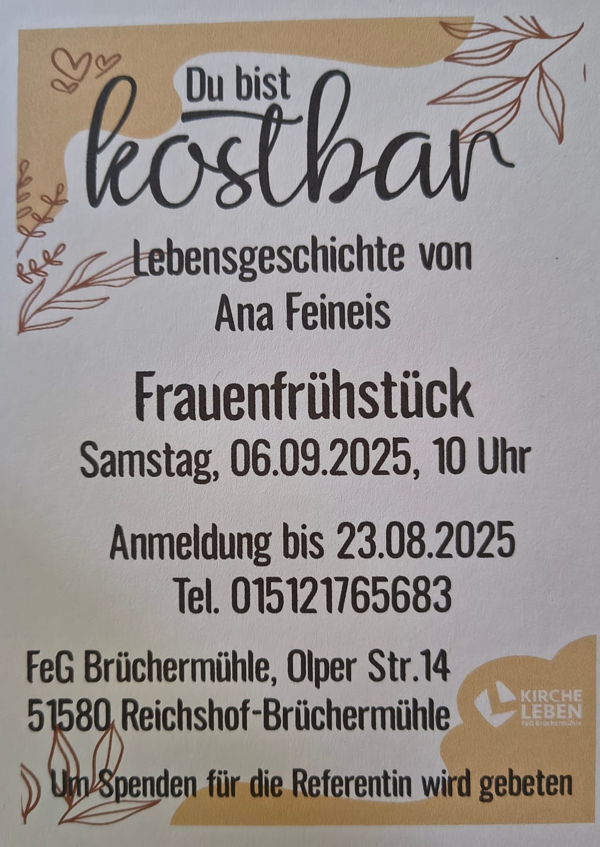 Es sind noch 9 Plätze frei. Wenn du in der Nähe wohnst komm vorbei und genieße Gemeinschaft und ein kostenfreies Frühstück mit 80 Frauen. Ich werde eine spannende Geschichte über Jesus erzählen und zum Thema Versorgung ermutigen. Und wenn du jmd mitbringen kannst der Jesus noch nicht kennt, das wäre mega... Bitte anmelden unter 015121765683
